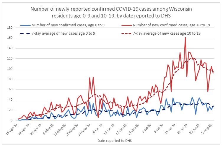 Across Wisconsin, there has been a recent rise in the 10-19 age group since early July.