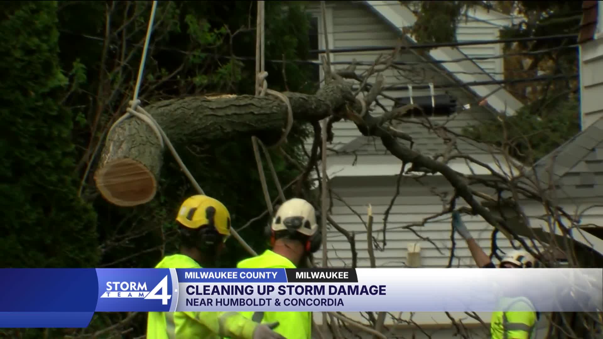 In the Riverwest neighborhood near Humboldt and Concordia, crews started working around 9 a.m. to remove a massive tree that fell onto two homes. The tree has since been removed, though the sidewalk still requires repairs.