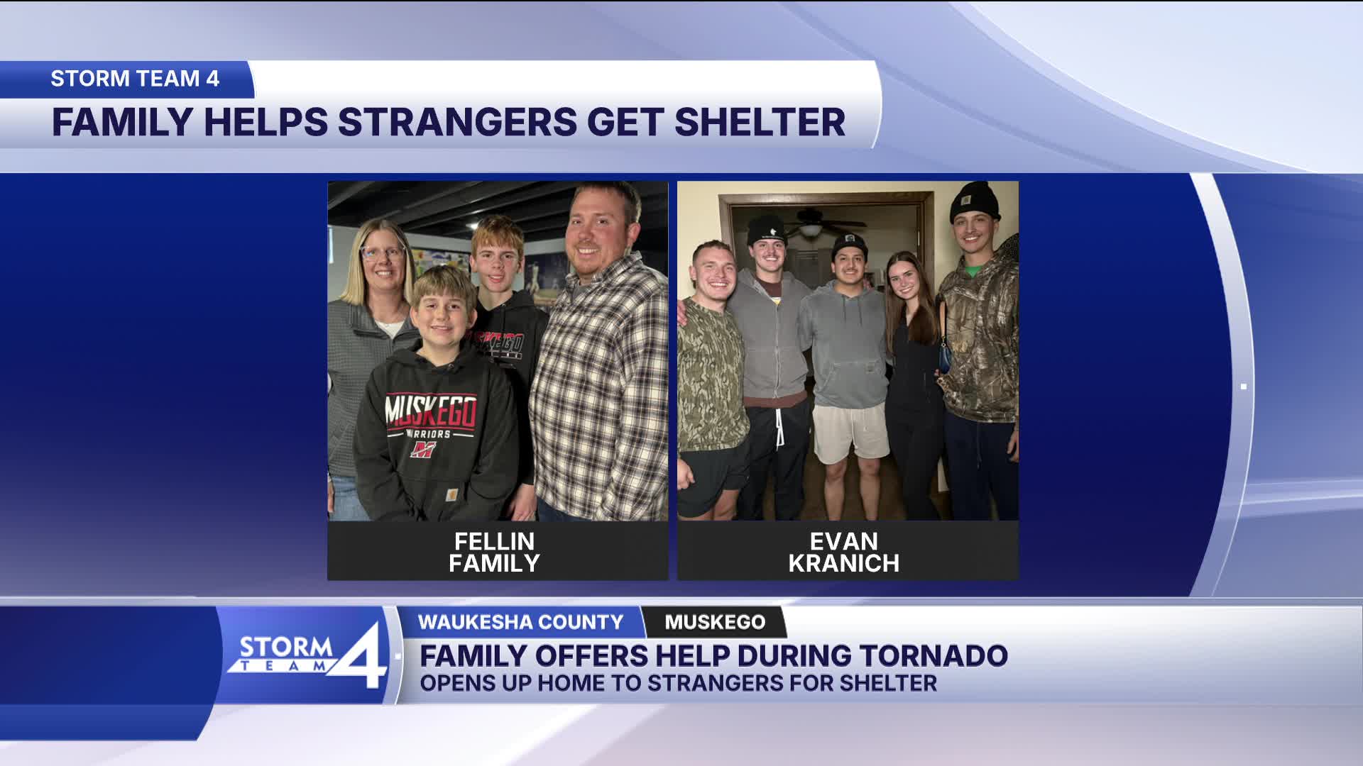 Watch: In a split-second decision, a Muskego family allowed a group of strangers into their home Friday night to seek shelter as severe storms barreled through the area.