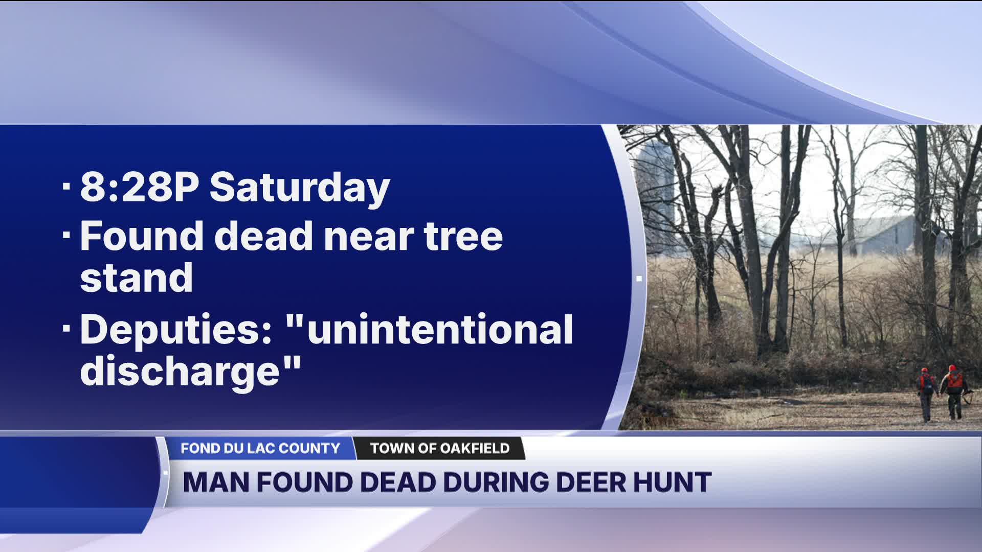 According to a release from the Fond du Lac County Sheriff's Office, it got a call at 8:28 p.m. on Nov. 22 from someone reporting a man who died at a tree stand near Stumpf Road and Wild Goose Road in the Town of Oakfield where he was hunting earlier in the day.