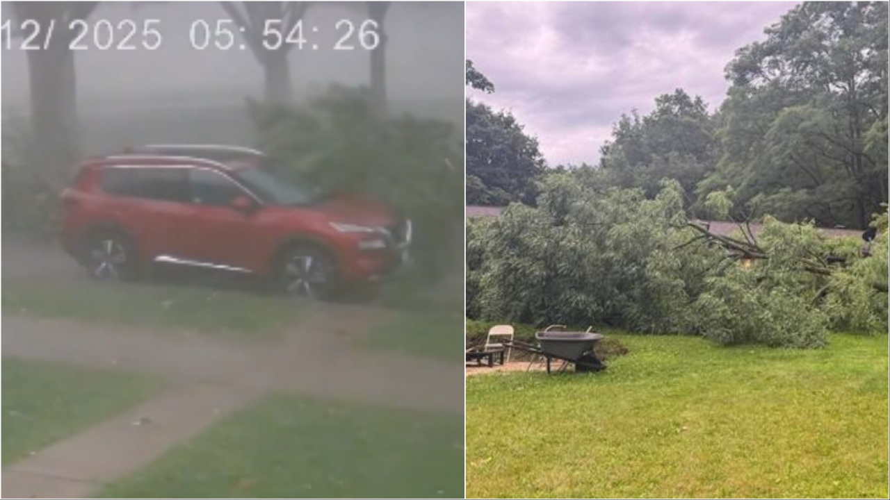 Doorbell camera video shows storms rolling through Brookfield, with the homeowner reporting multiple trees down in the area.