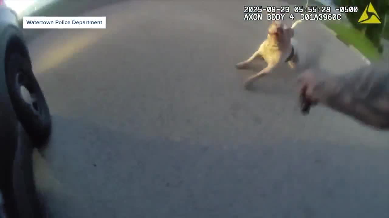 Police released approximately two minutes of body cam video Monday showing the dogs charging at an officer moments after he stepped out of his vehicle. Watertown police said that, for the officer's safety, one of them discharged a firearm, striking one of the dogs.