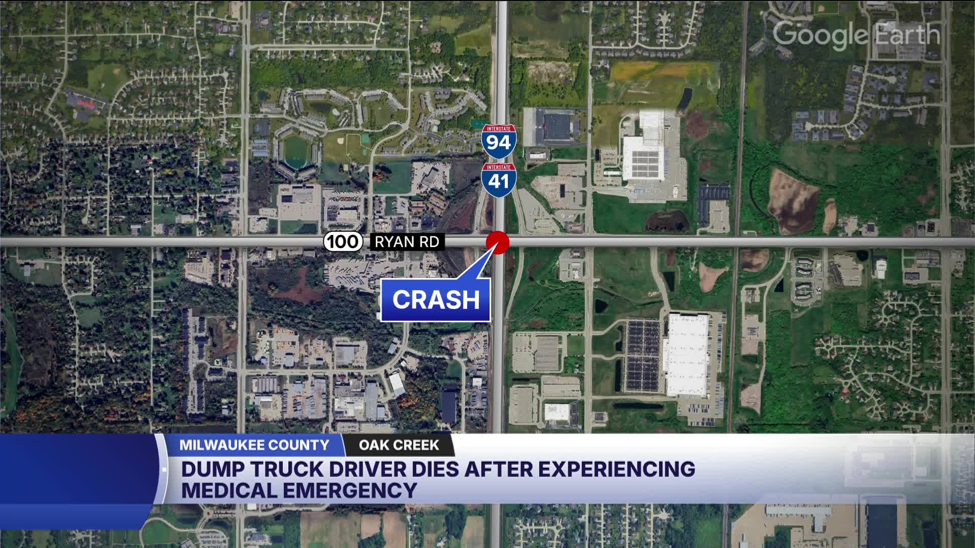OAK CREEK, Wis. — A ramp to northbound I-94 from Ryan Road was closed Monday after a dump truck driver experienced a medical emergency and veered off the freeway, according to the Milwaukee County Sheriff’s Office.