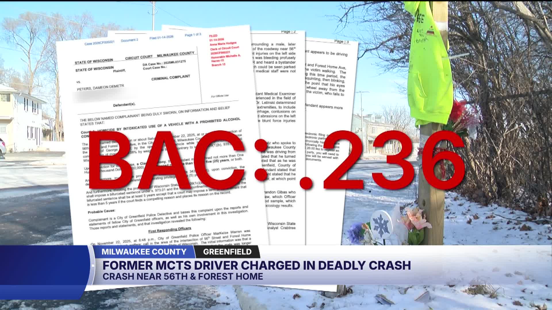 Dameon Demetr Peters, 55, was driving an MCTS bus eastbound on Forest Home Avenue near 56th Street when he hit Kayser at 6:47 p.m., according to a criminal complaint filed January 14. A toxicology report showed Peters' blood alcohol content was 0.236 — nearly three times the legal limit of 0.08 in Wisconsin.