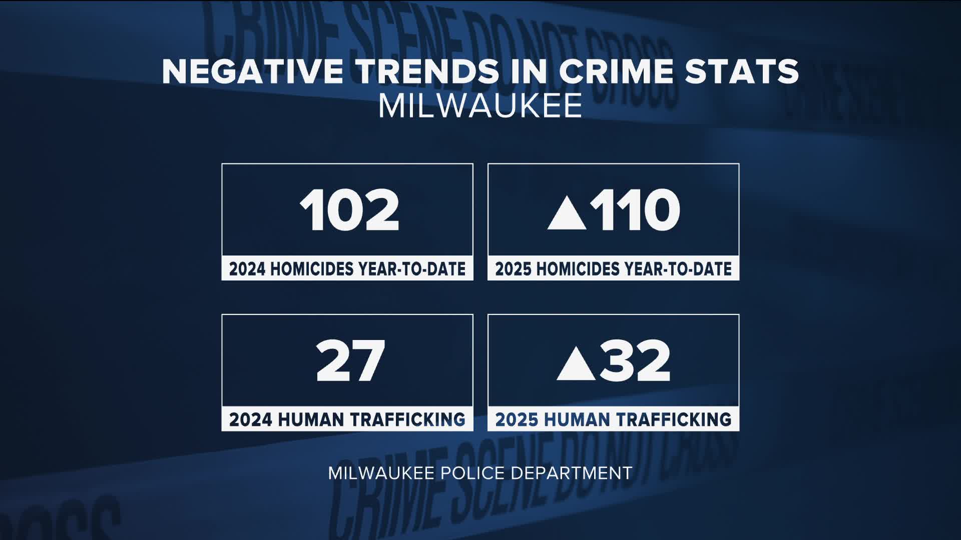 MILWAUKEE — The Milwaukee Police Department announced mixed crime statistics during a city press conference Friday, with significant decreases in carjackings and non-fatal shootings but increases in homicides and human trafficking cases.