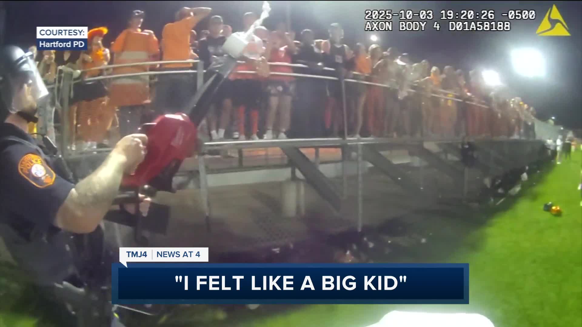 HARTFORD, Wis. — Two police officers turned a toilet paper prank back on the culprits at the Hartford Union High School homecoming football game.