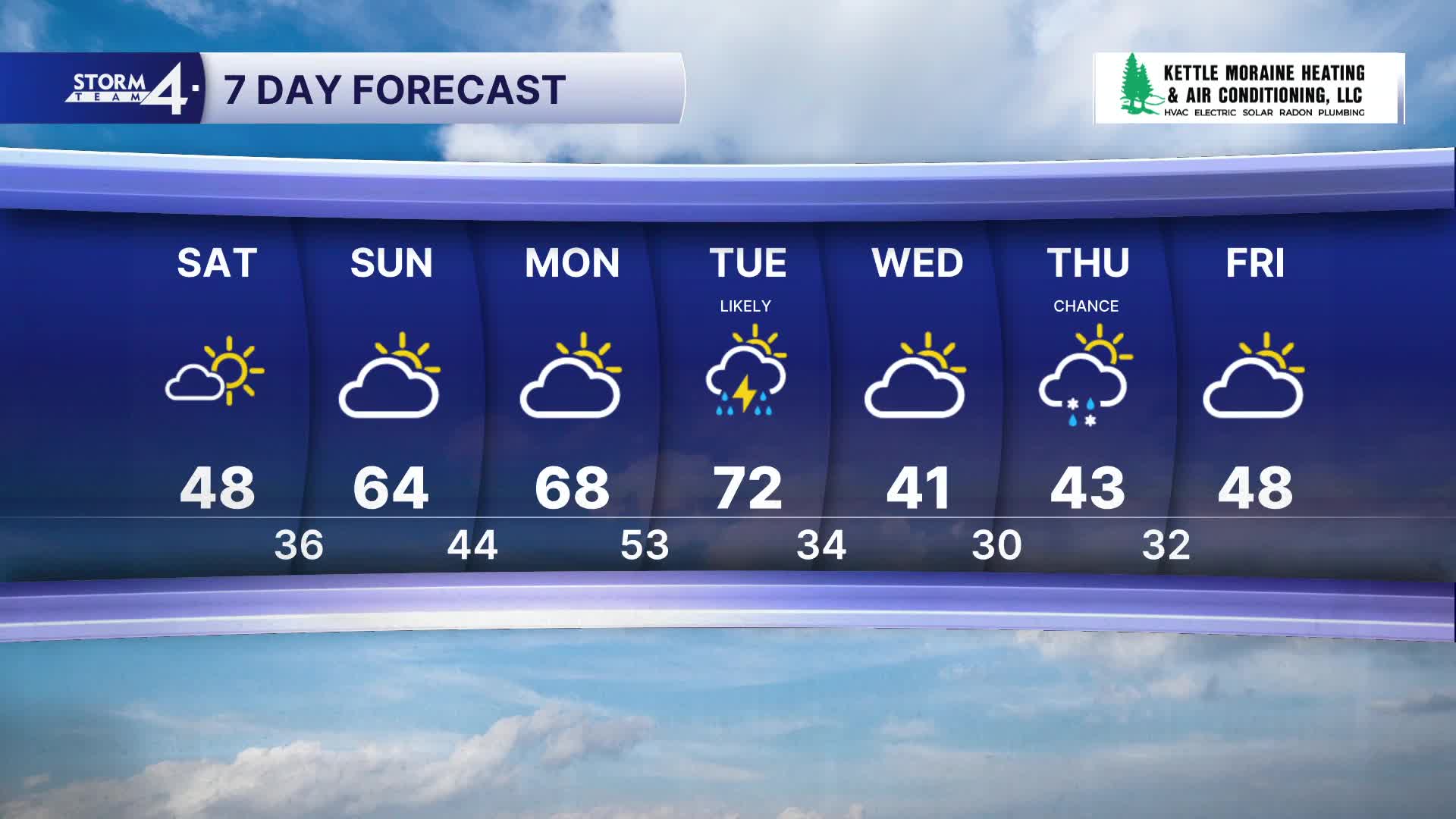 Sunday will be the pick day of the weekend with breezy and mild conditions. Highs will top out in the low 60s, but that breeze should keep the lake influence away.