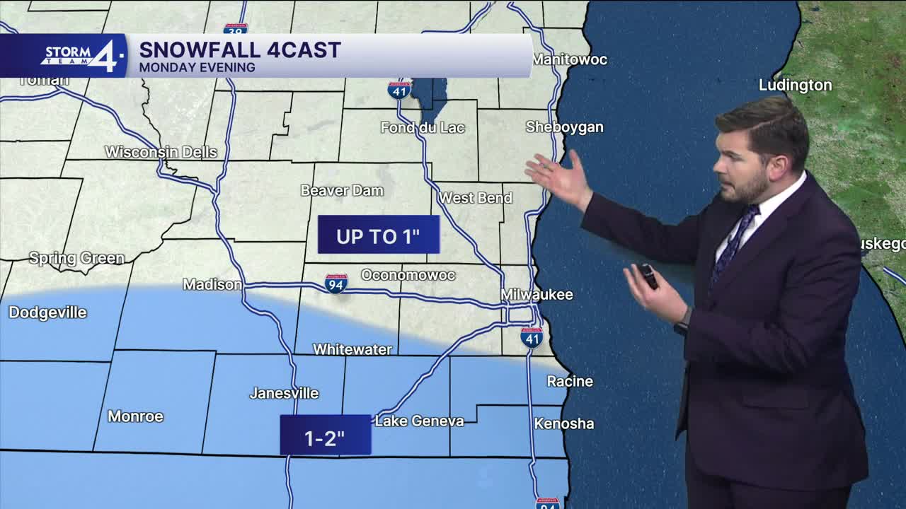 Light snow showers will overspread southern Wisconsin later this afternoon — around 2 p.m. Snow showers will let up closer to 10 p.m. Accumulations may reach up to 1 inch around Milwaukee, with 1 to 2 inches possible south of I-94. Overnight lows drop into the teens.