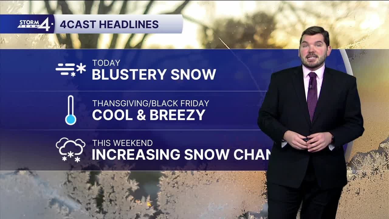 Snow showers will gradually taper off late this afternoon. Overnight lows will fall into the 20s, while wind gusts continue to top out around 30 to 35 mph. This means wind chills will tumble through the teens and into the single digits. A few flurries are possible on Thanksgiving Day. It will be breezy with highs in the lower 30s.