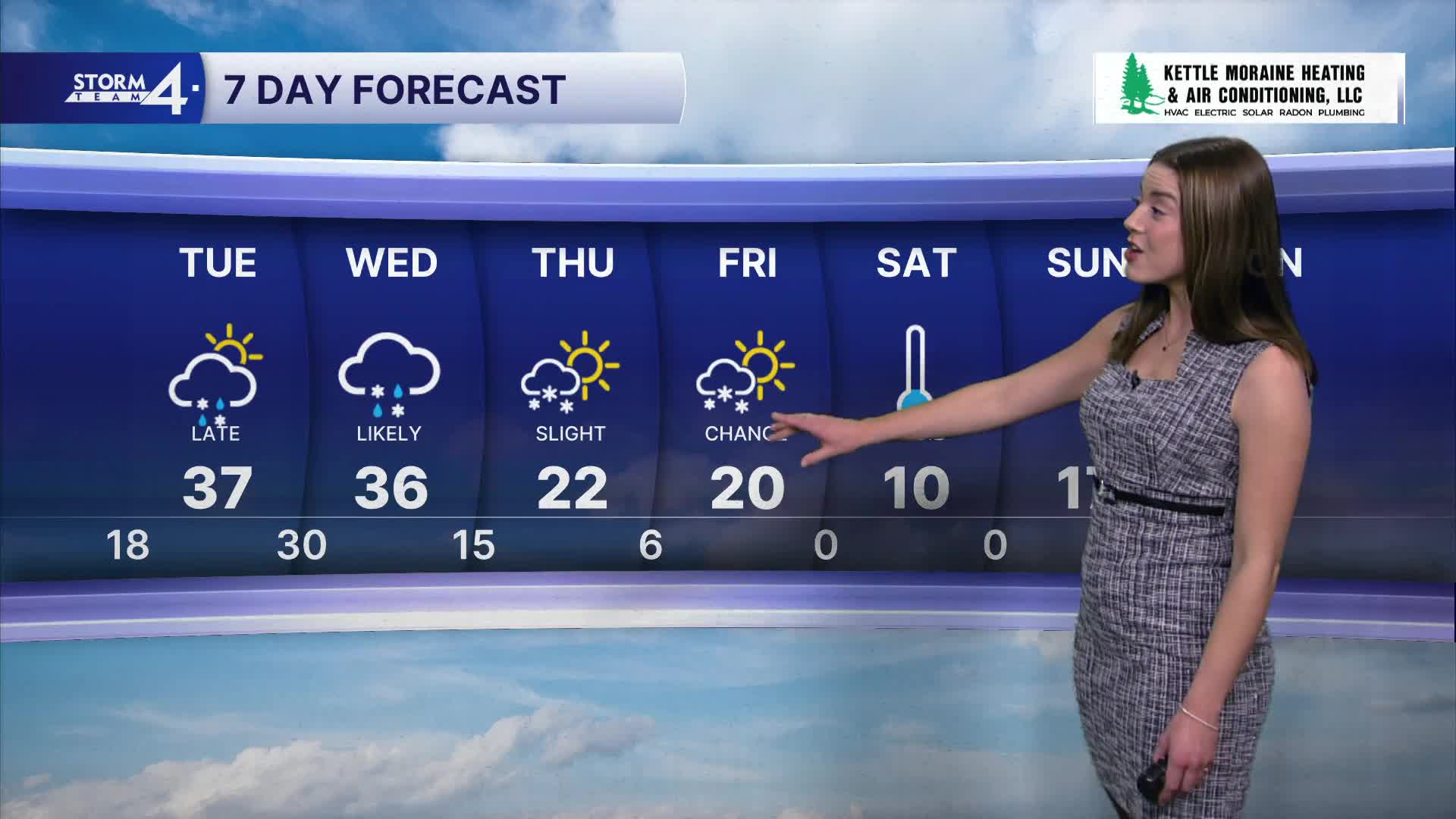 Tonight, our lows fall into the teens as another clipper system rolls through Wisconsin. A dusting to an inch of snow is possible — especially far North of Milwaukee. Slick spots are possible early Tuesday morning.