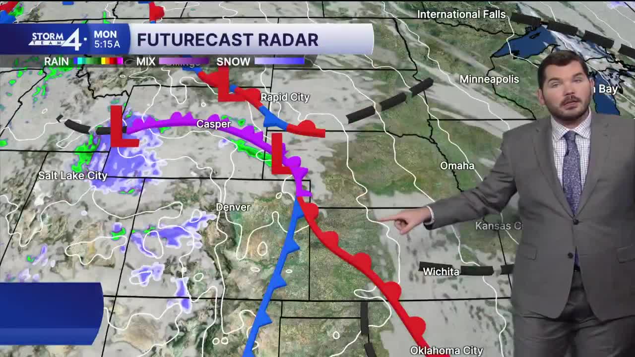 Storm Team 4 is monitoring a Colorado low that will move across the Plains later today and throughout tomorrow. On the north side of this system, a narrow swath of heavy, wet snow is expected to fall along with a cold rain. The rain will pick up early Tuesday morning and may mix with snow at times.