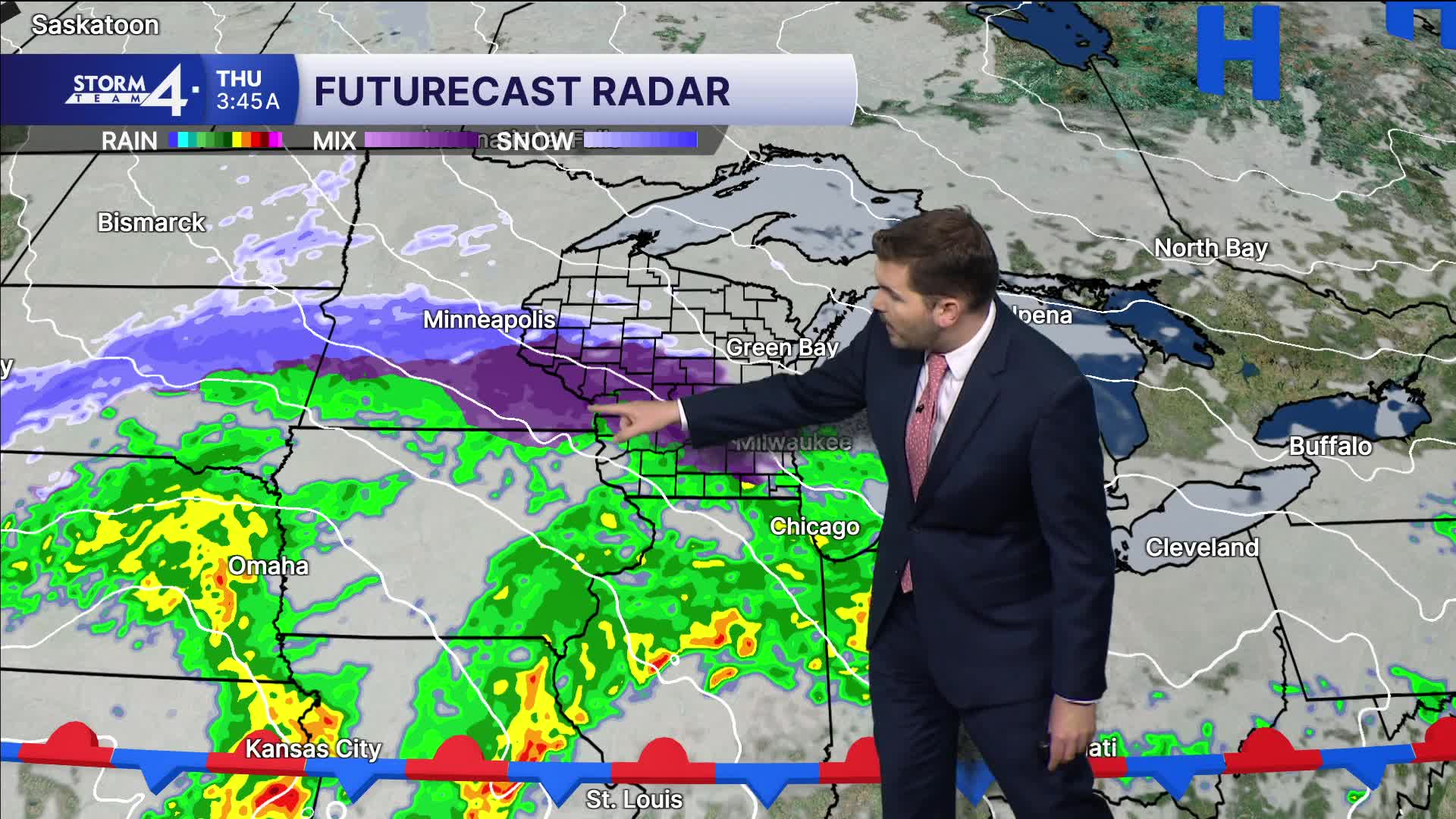 An area of low-pressure moves in from the Southwest throughout the Thursday forecast. Scattered showers move in after midnight and continue throughout the day. There is a possibility of a wintry mix/freezing rain that may move by during the morning hours on Thursday. This risk will be highest far North of Milwaukee.