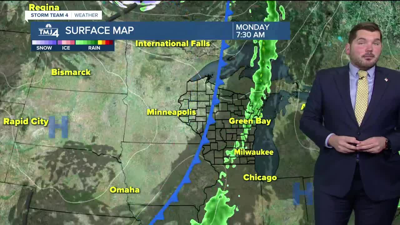 A line of scattered showers is moving through Wisconsin early Monday morning. More persistent rain is positioned farther northwest of Milwaukee. That said, a few stray showers are possible this morning and into the afternoon as the frontal boundary passes by. A mostly cloudy sky is expected today as highs climb into the upper 60s to lower 70s.