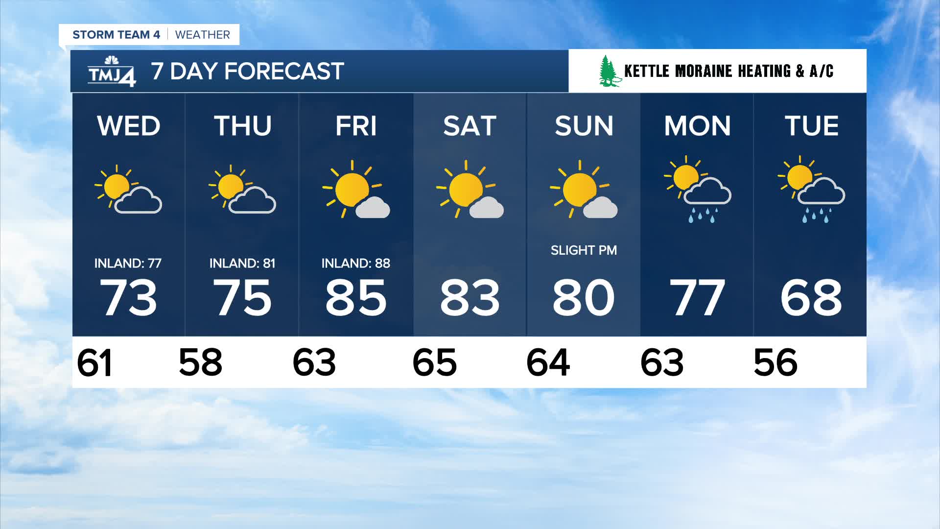 The lake breeze will be a bit more pronounced in the days ahead — keeping Milwaukee in the lower 70s while inland communities reach the upper 70s, near 80°. This is the case for Wednesday and Thursday. Again, not anticipating any rain and plenty of sunshine.