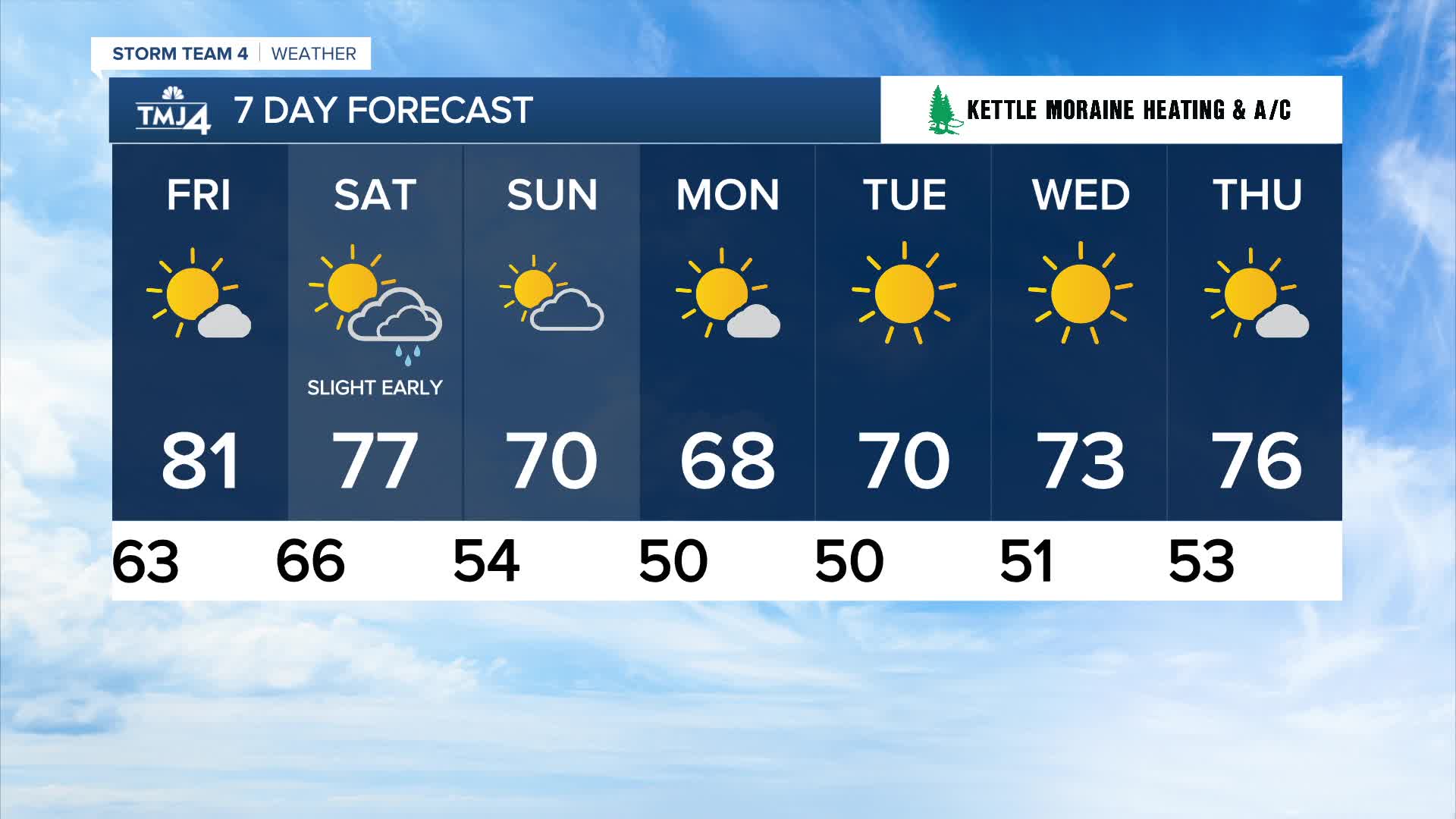 We'll still reach the middle to upper 70s on Saturday, but much of the area may not get out of the 60s on Sunday and Monday. Low temperatures will likely dip into the 40s Sunday night and Monday night. This will be our first brush with fall.