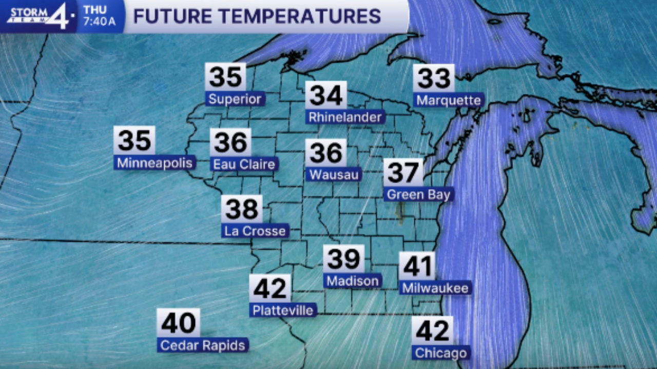 Overnight lows will crash into the single digits early Friday, but the cold blast will be short-lived. After highs top out in the 20s, temperatures will rebound into the 30s by Saturday. A few flurries are possible north of Milwaukee.