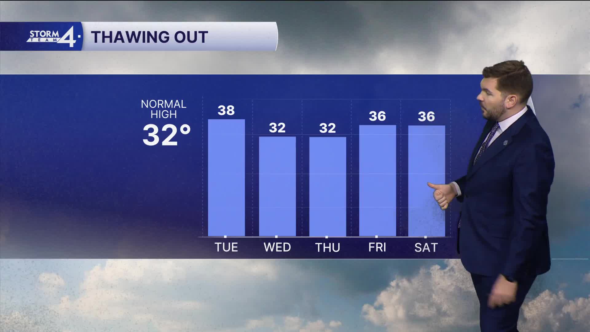 Overnight lows drop to around 30, but a quick warm-up into the upper 30s is anticipated tomorrow afternoon. Some spots may reach 40-degrees.