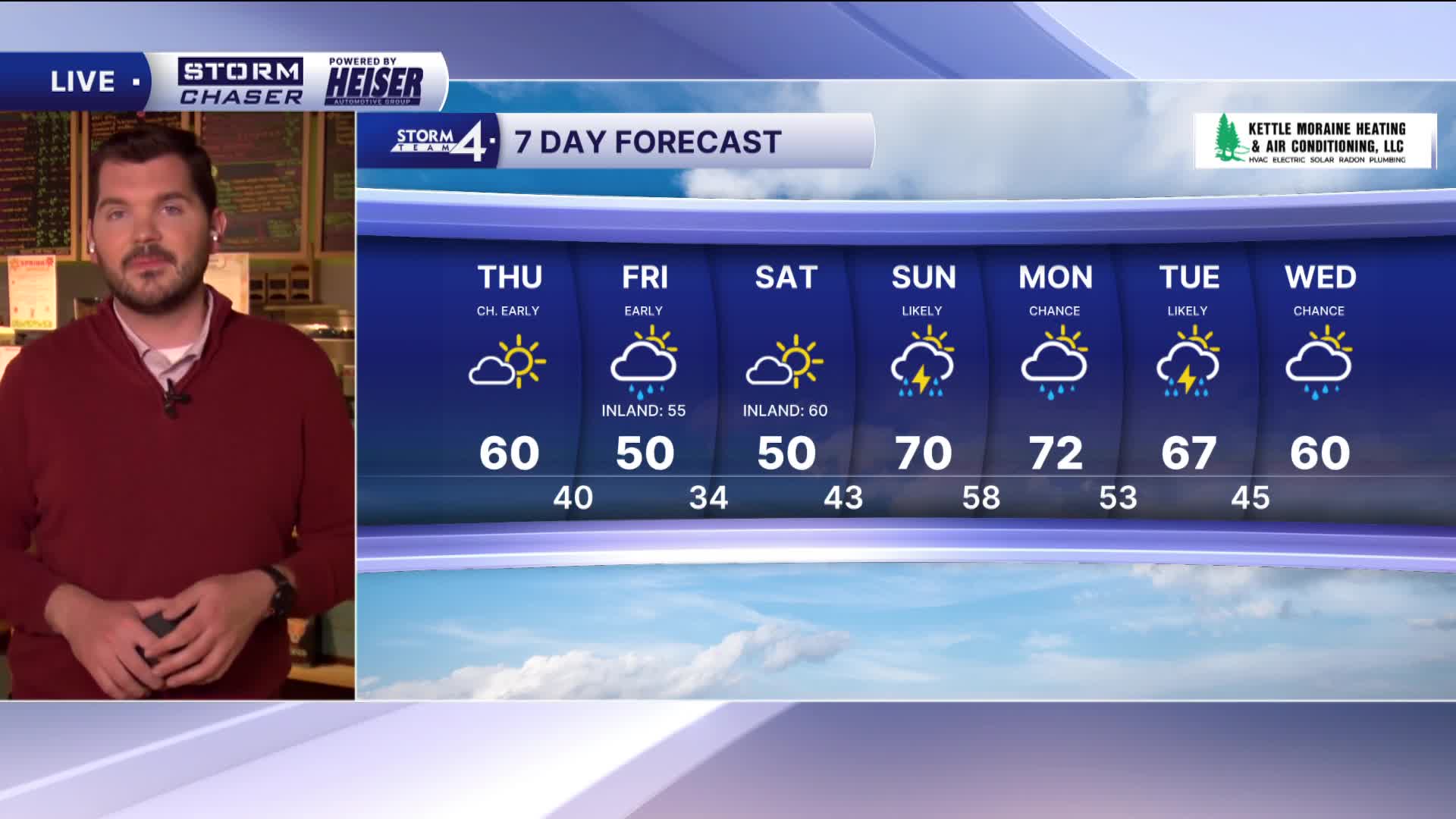 Scattered showers and thunderstorms are likely on Sunday. Highs jump into the lower 70s. Additional rounds of rain/storms continue into Monday, Tuesday & Wednesday.