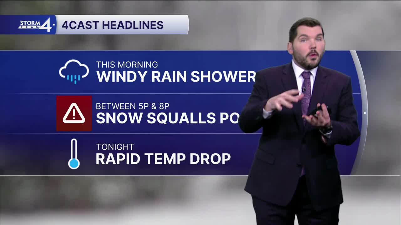 Any snow squalls will move through between 5 p.m. and 8 p.m. Even if whiteout conditions do not occur, rapidly falling temperatures may lead to a flash freeze on untreated roadways and surfaces. Overnight lows will crash into the teens. Blustery conditions will persist tonight, with wind gusts up to 40 mph.