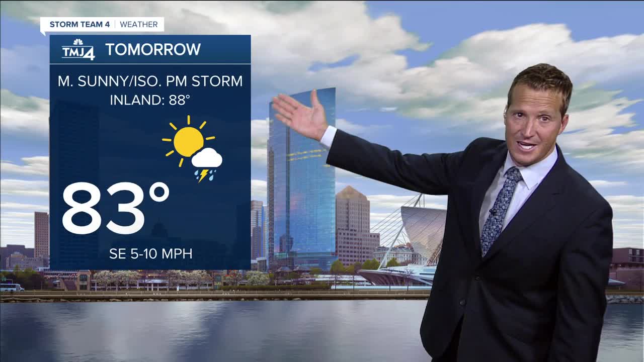 Inland storms fired up this afternoon where we experienced peak heating. Any remaining storms should dissipate by sunset. Skies tonight will be partly cloudy with lows around 60 degrees. You may have noticed a little more humidity to the air, causing some of you to make the switch to AC inside your home. We could see a repeat of the inland storms again tomorrow afternoon, but they'll likely set up even farther west, mainly across Jefferson and Dodge counties.